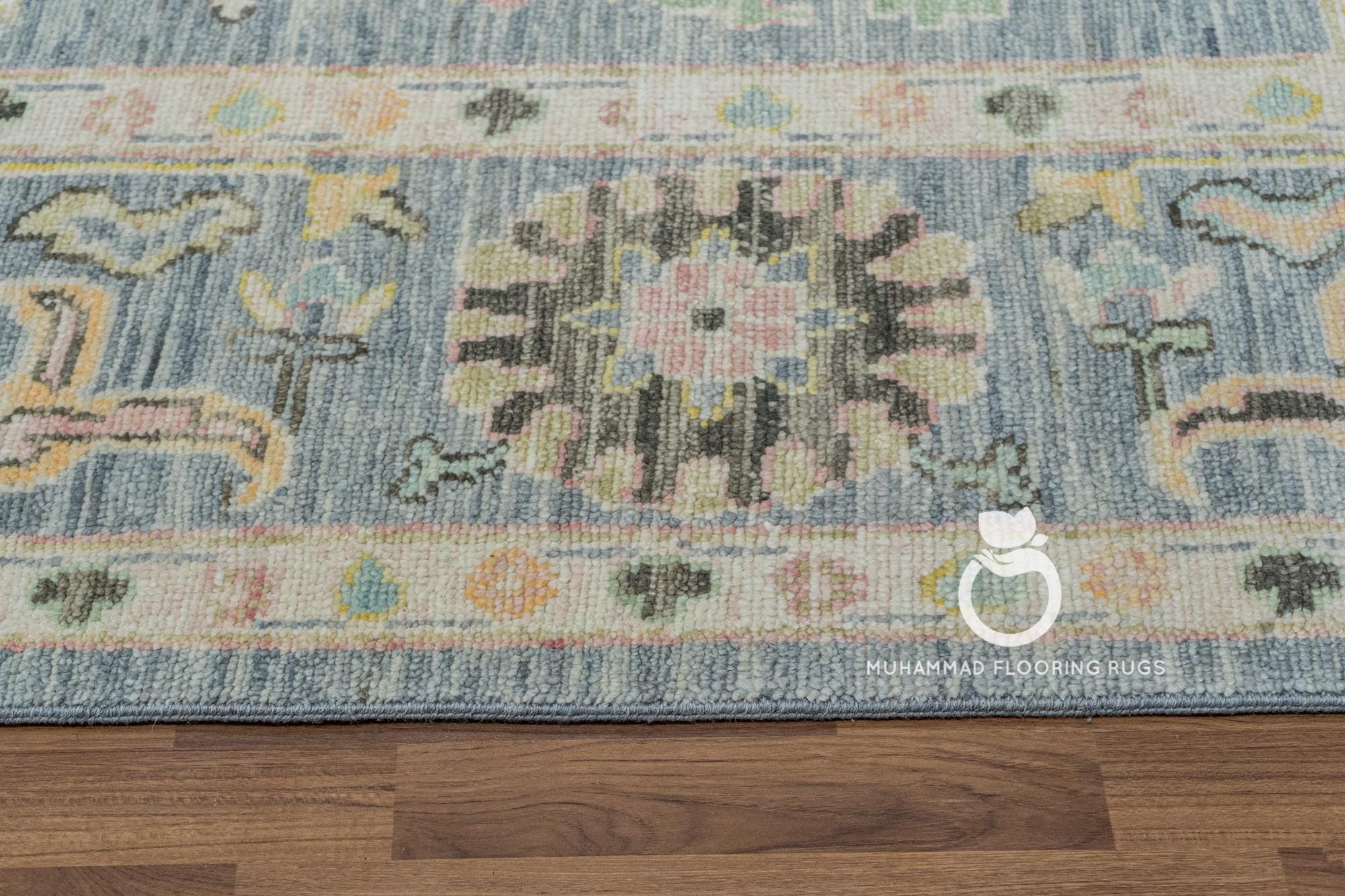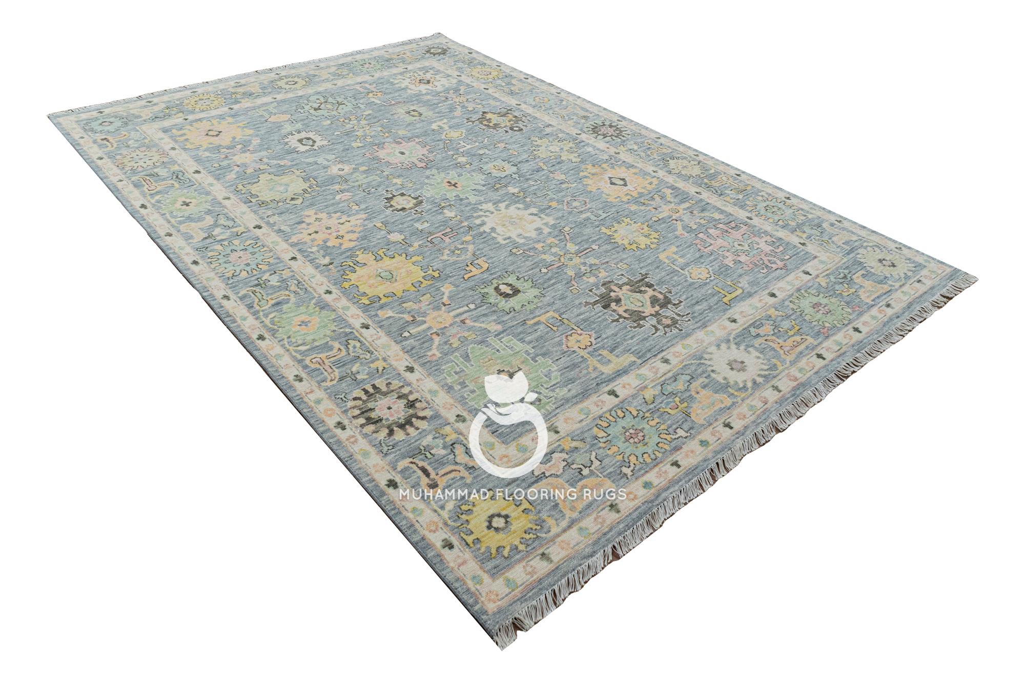 Vintage Turkish Wool Rug: Elegant 9x12 Light Blue Oushak Carpet Classic Turkish Oushak Rug in Light Blue Handcrafted Vintage Wool Carpets