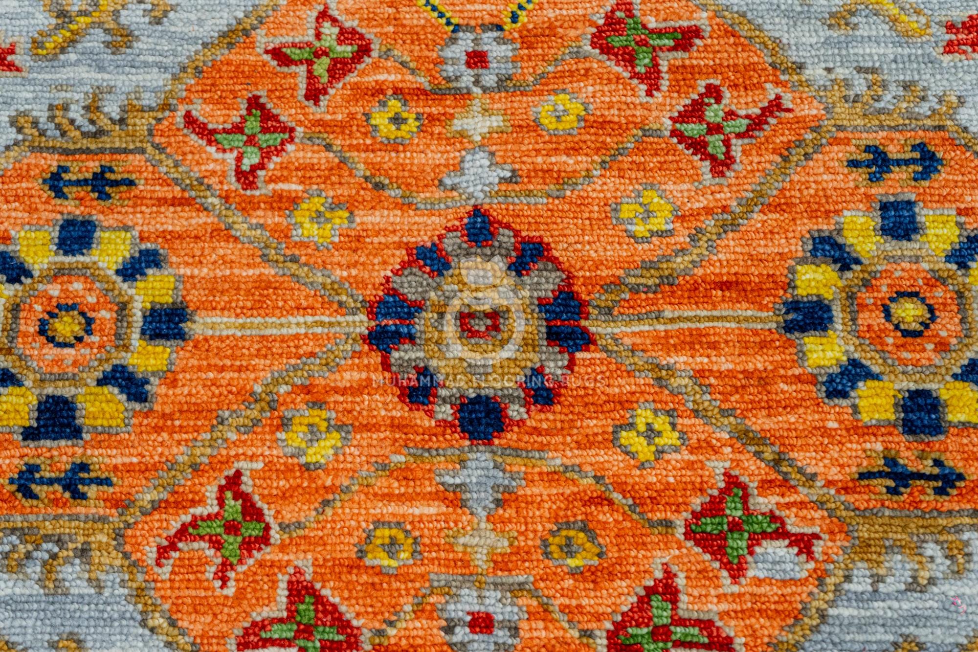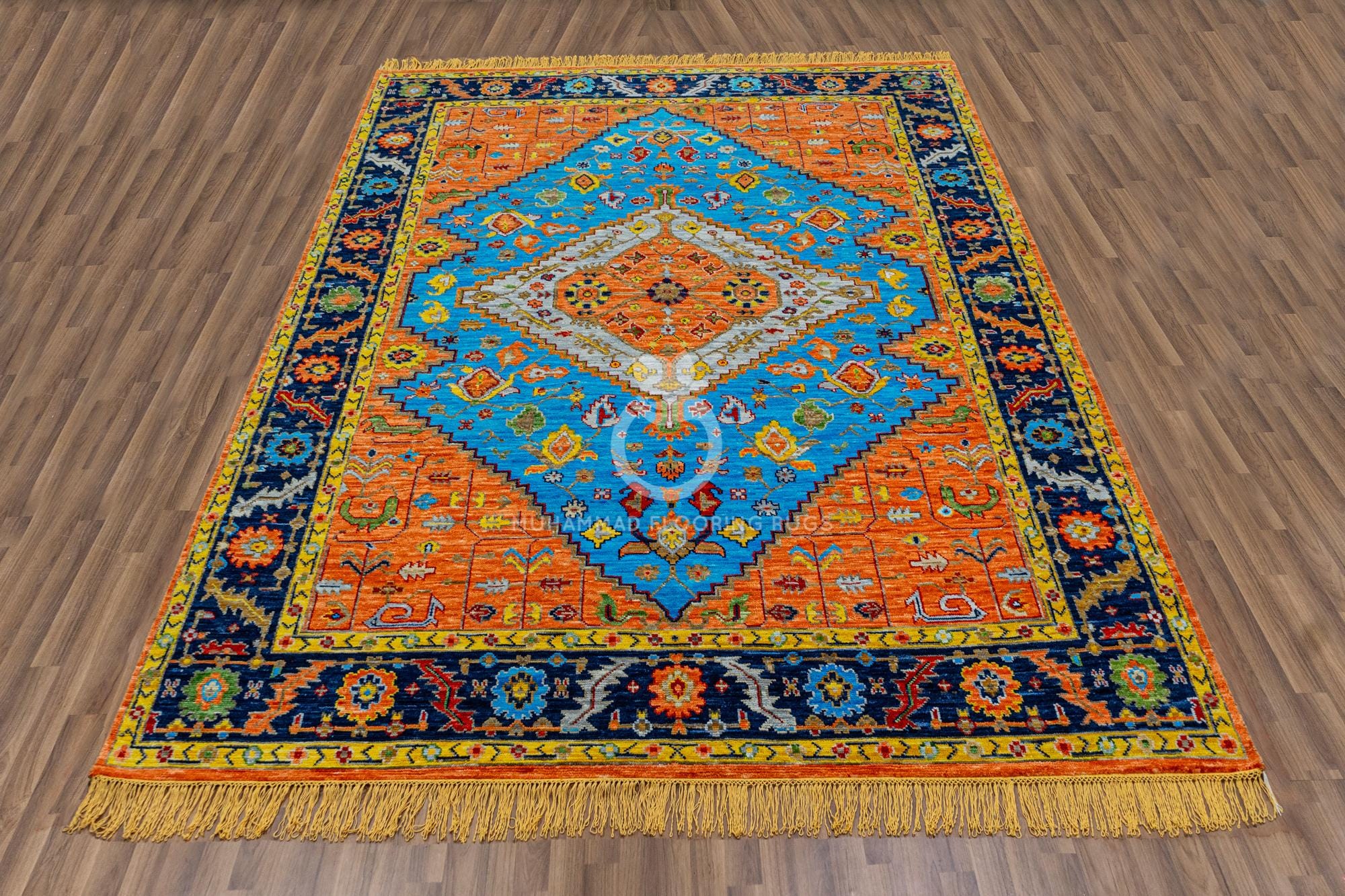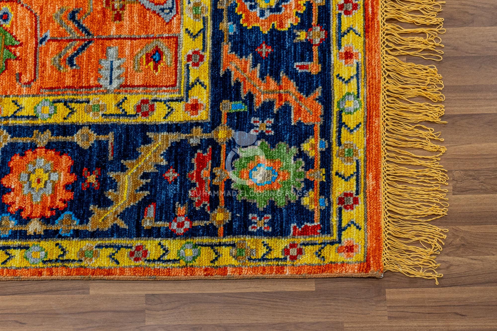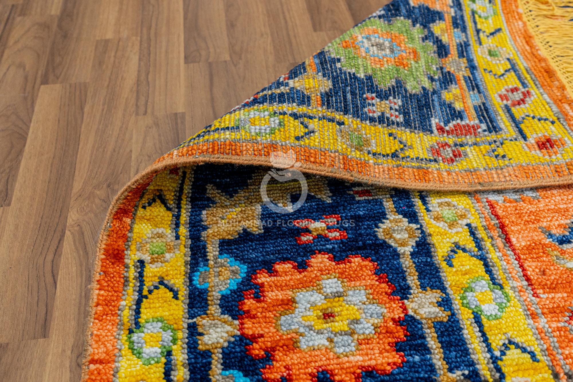 Bohemian Chic Geometric Wool Carpet in Vibrant Blue & Orange Artisanal Beauty Turkish Oushak Rug with Vibrant Blue Orange Hues