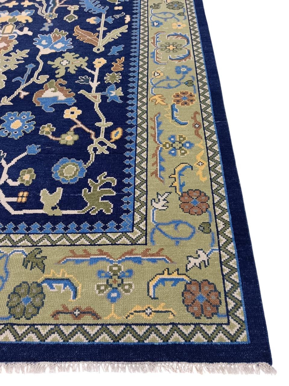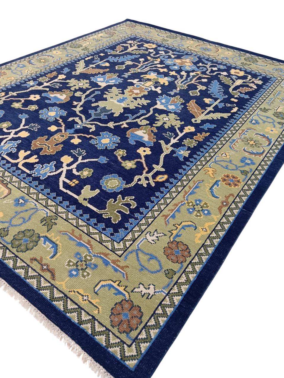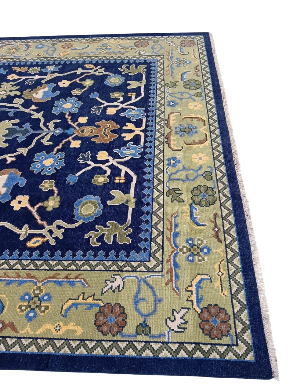 Hand-Knotted Navy Blue Oushak Rug – Turkish Wool Floral Motif – 9x12 ft – Vintage Inspired Area Carpet Traditional rug vintage rug