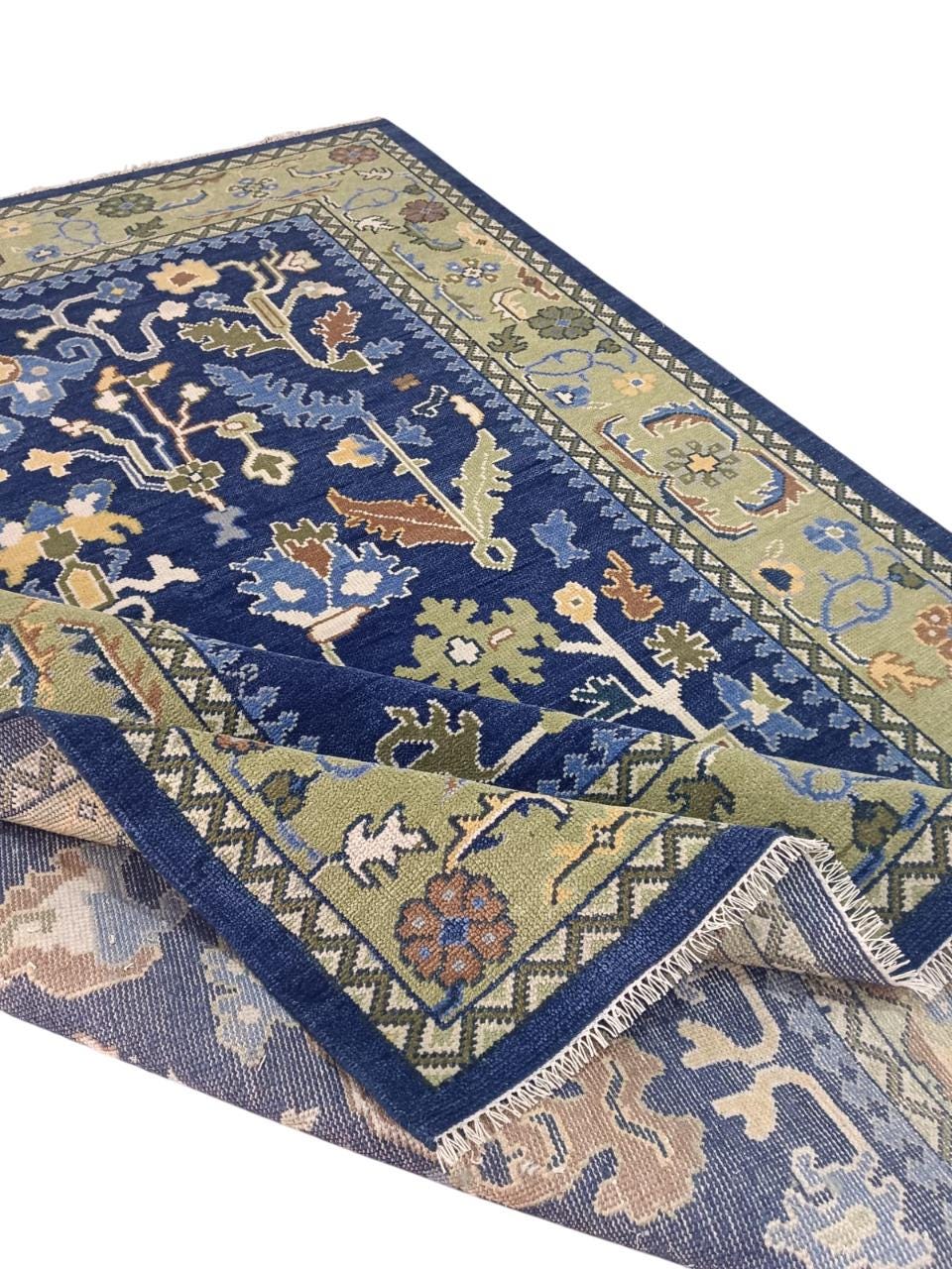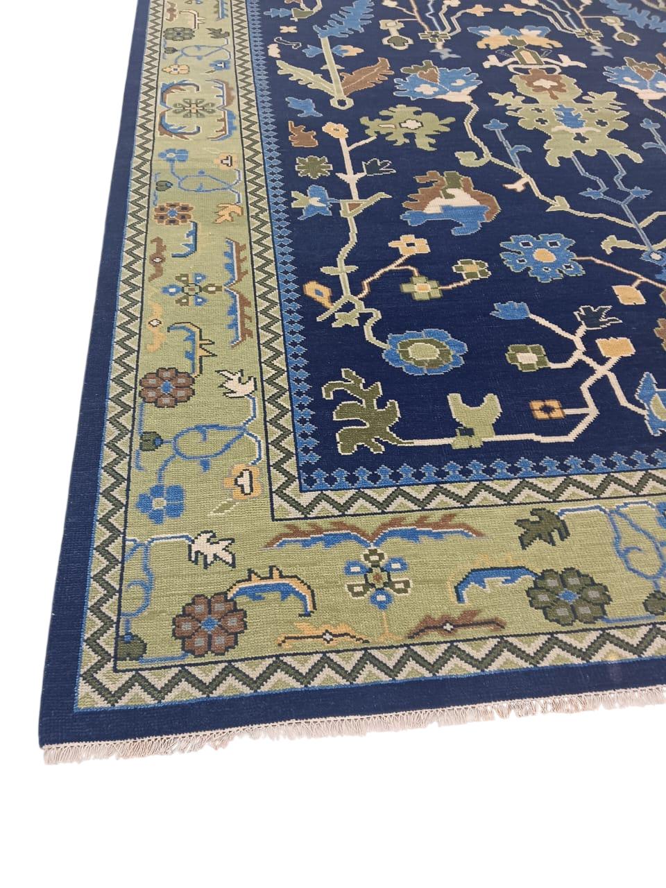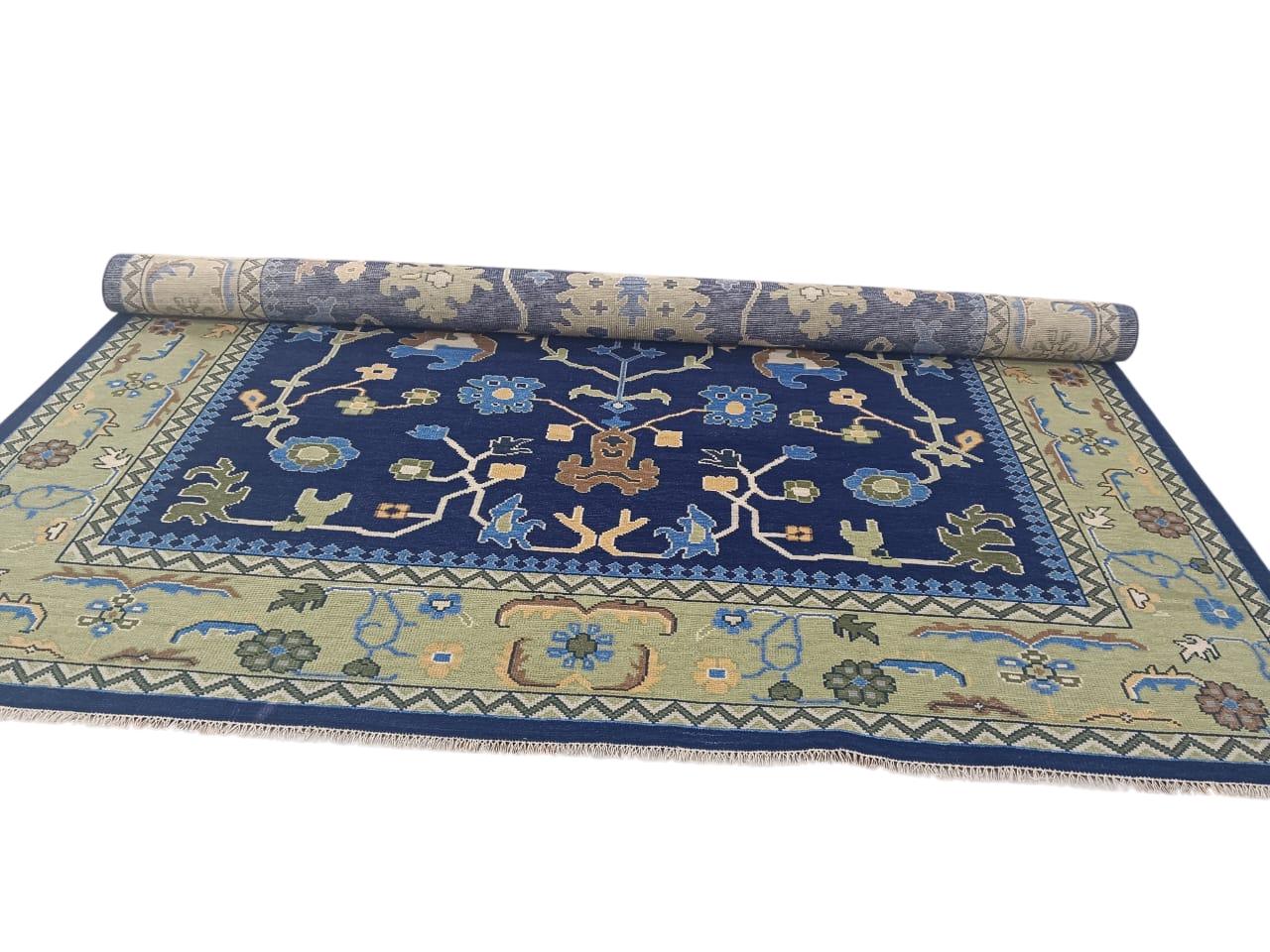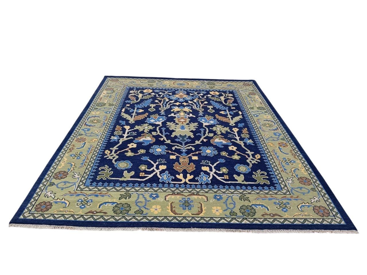 Hand-Knotted Navy Blue Oushak Rug – Turkish Wool Floral Motif – 9x12 ft – Vintage Inspired Area Carpet Traditional rug vintage rug