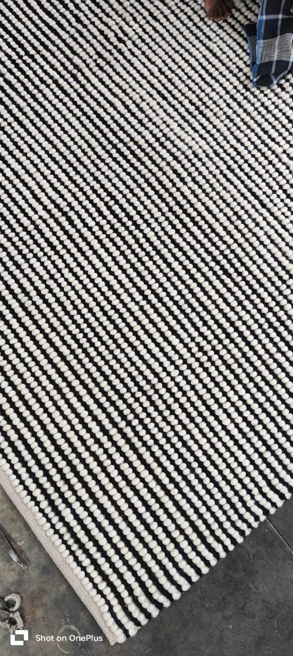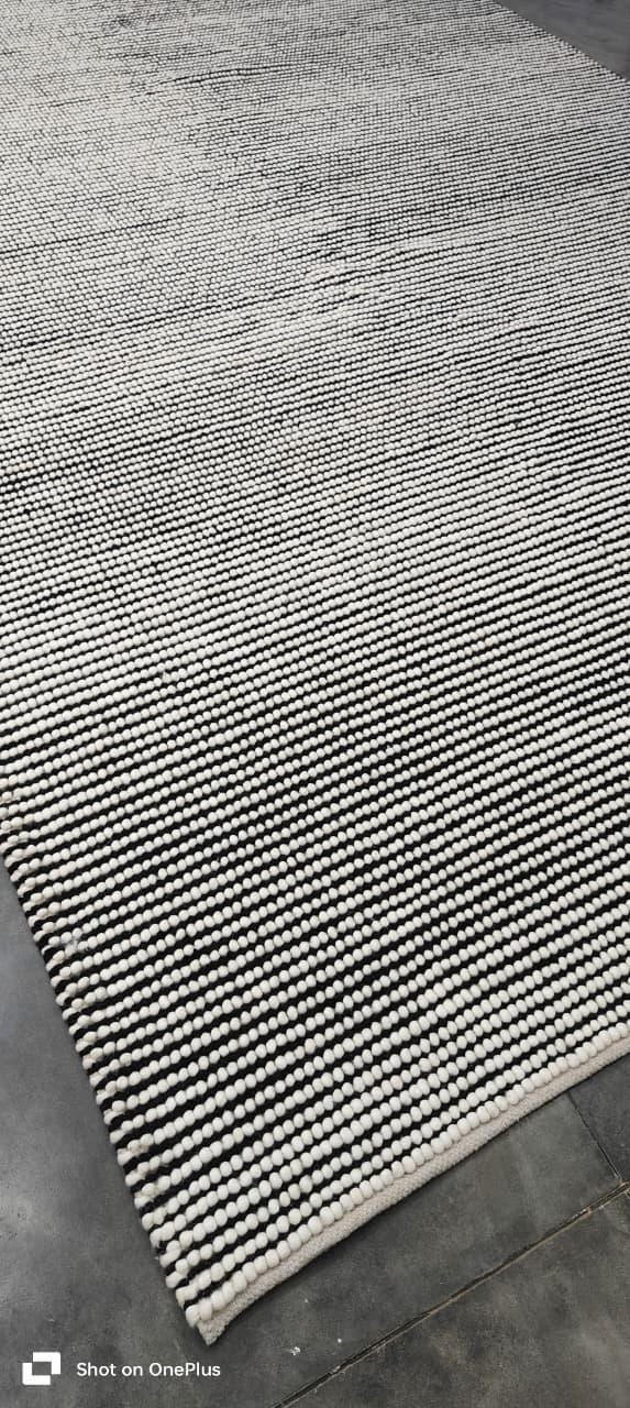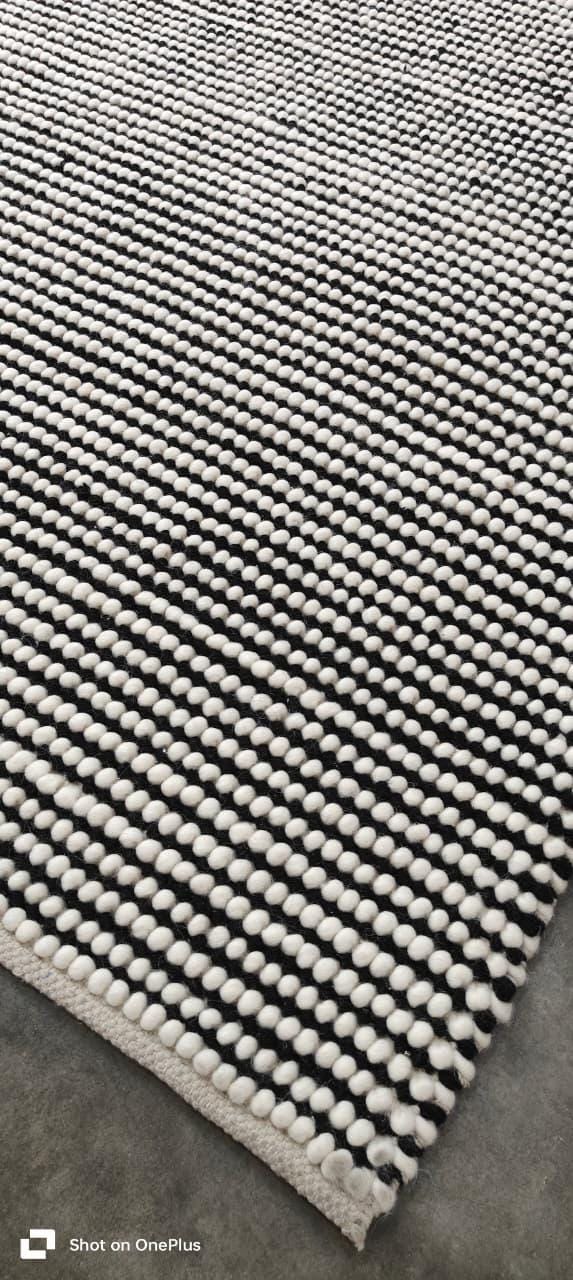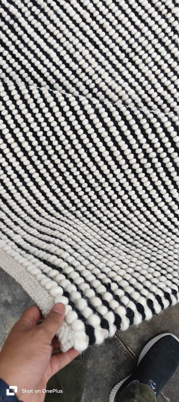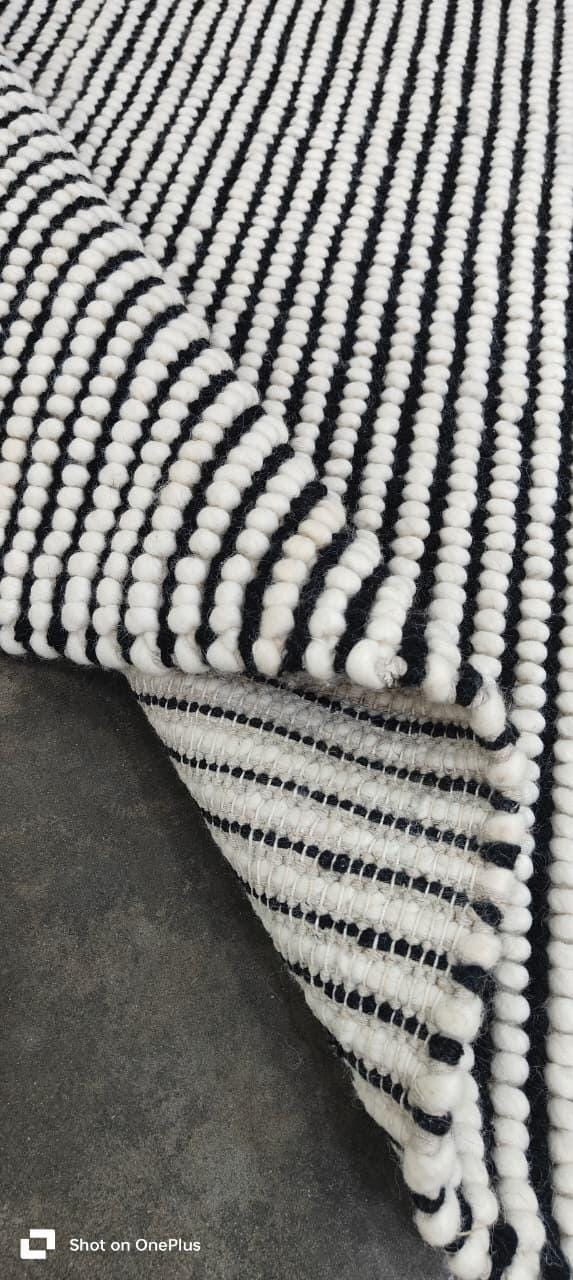 Handwoven Modern Wool Rug – Black & White Textured Stripes, Scandinavian Minimalist Decor, Cozy Pebble Weave Area Carpet