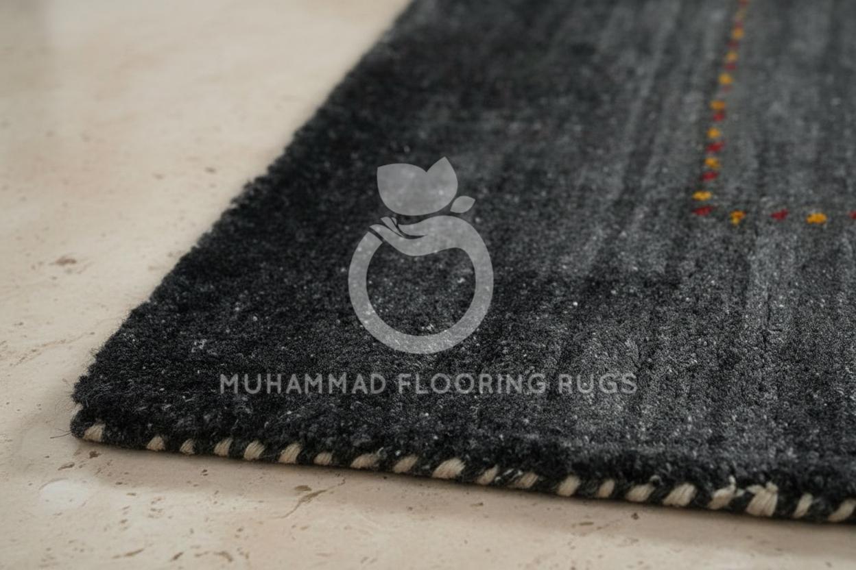Charcoal Grey Wool Area Rug | Handwoven Gabbeh Tribal Accent Carpet | Contemporary Minimal Decor Blackish Grey Gabbeh Rug | Modern Border